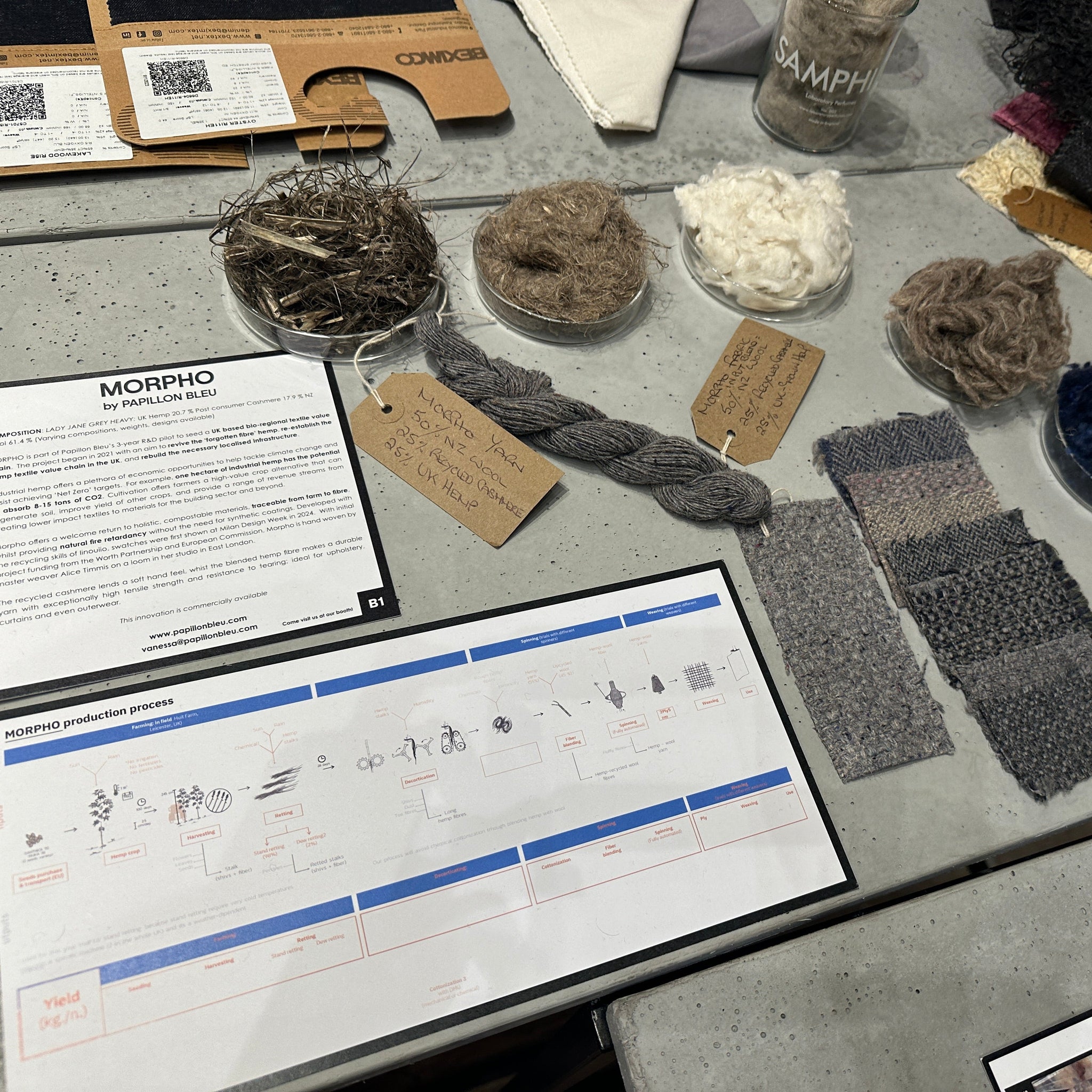 - Elegant and innovative, this grey basket weave fabric blends UK hemp, recycled cashmere, and New Zealand merino lambswool for exceptional softness and structure. At 460 gsm, it offers warmth, texture, and refined drape, ideal for outerwear or statement tailoring. Made to order in the UK with a 50-meter MOQ, it reflects Papillon Bleu’s commitment to regenerative, low-impact luxury.