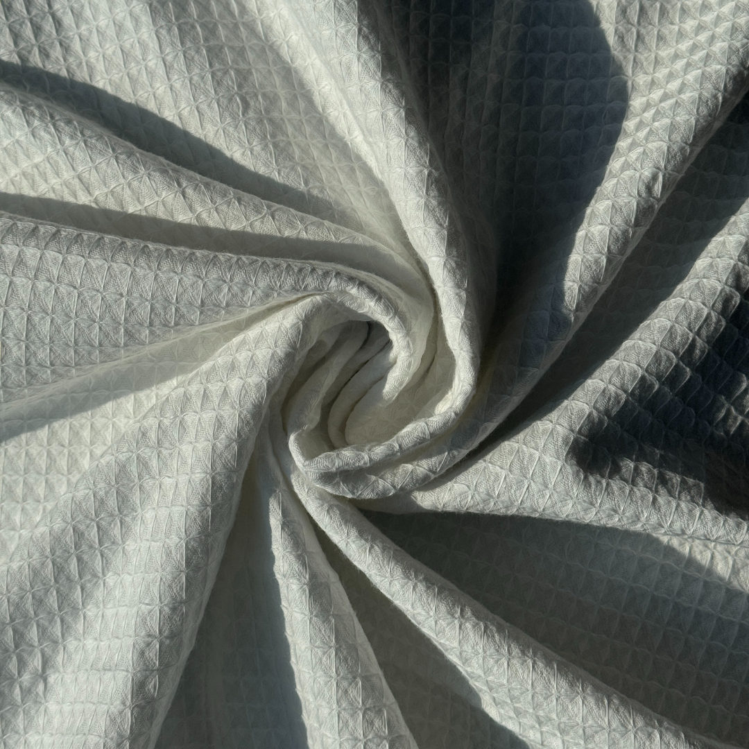 - Softly textured and responsibly made, this white waffle fabric is crafted in the UK from 100% rainfed organic cotton grown through regenerative agriculture at the farm level. At 224 gsm, it offers gentle structure and breathability — ideal for casual apparel, loungewear, or home textiles. Ready to ship with a 1000-meter MOQ, it embodies circular, soil-positive production and transparent sourcing.